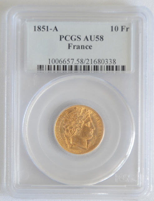 PCGS社の鑑定ケースには10フランで表記されていますが20フラン金貨です。