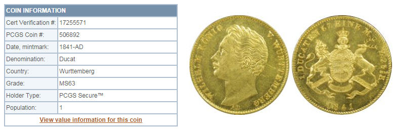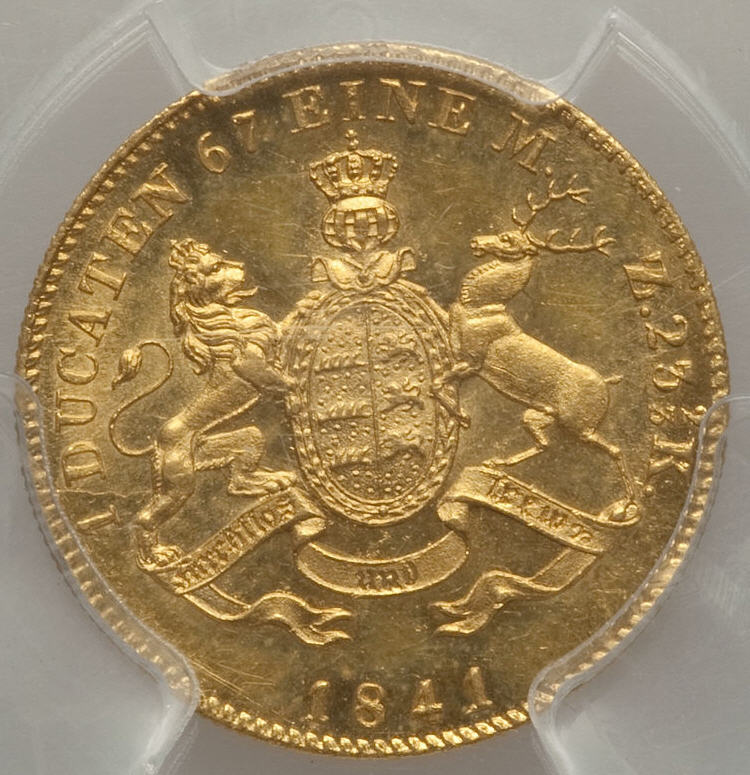 「アンティークコイン金貨専門のゴールドコイン」で取り扱う商品「ドイツ1ダカット金貨 German States Wurttemberg. Wilhelm I gold Ducat 1841-AD MS63 PCGS」の紹介・購入ページ