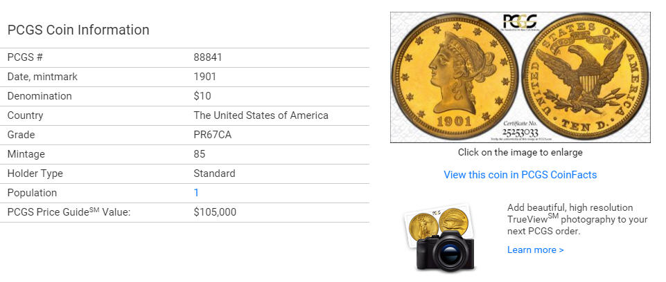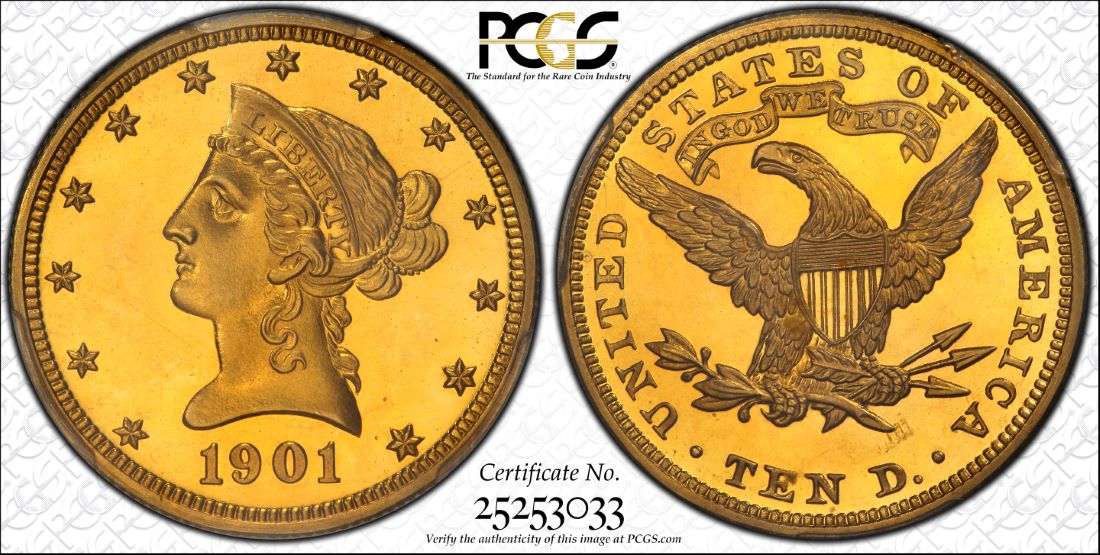 「アンティークコイン金貨専門のゴールドコイン」で取り扱う商品「アンティークコイン アメリカ 10ドル金貨リバティヘッド 1901$10 PCGS PR67CAM」の紹介・購入ページ