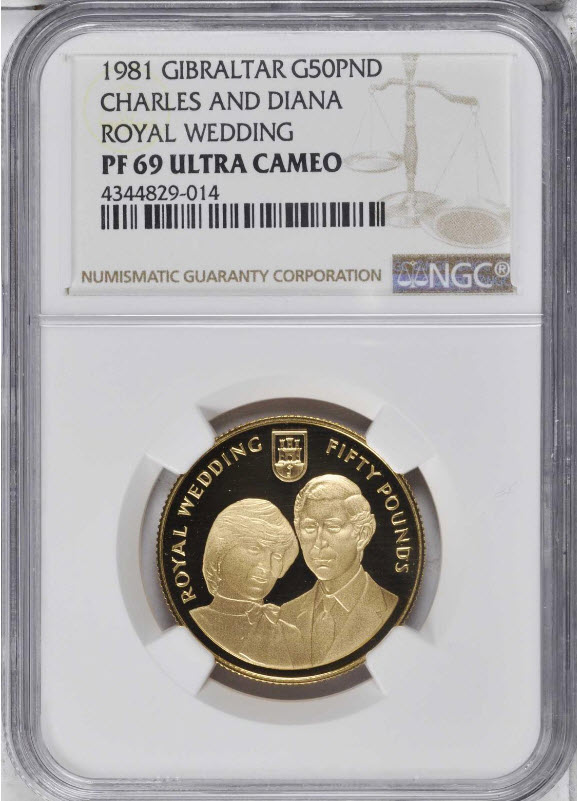 「アンティークコイン金貨専門のゴールドコイン」で取り扱う商品「【セール品動画あり】【残存3枚】1981 年 グレートブリテン領 ジブラルタル50ポンドプルーフ金貨 NGCチャールズ皇太子 ダイアナ妃結婚式記念 PF69UCAM」の紹介・購入ページ