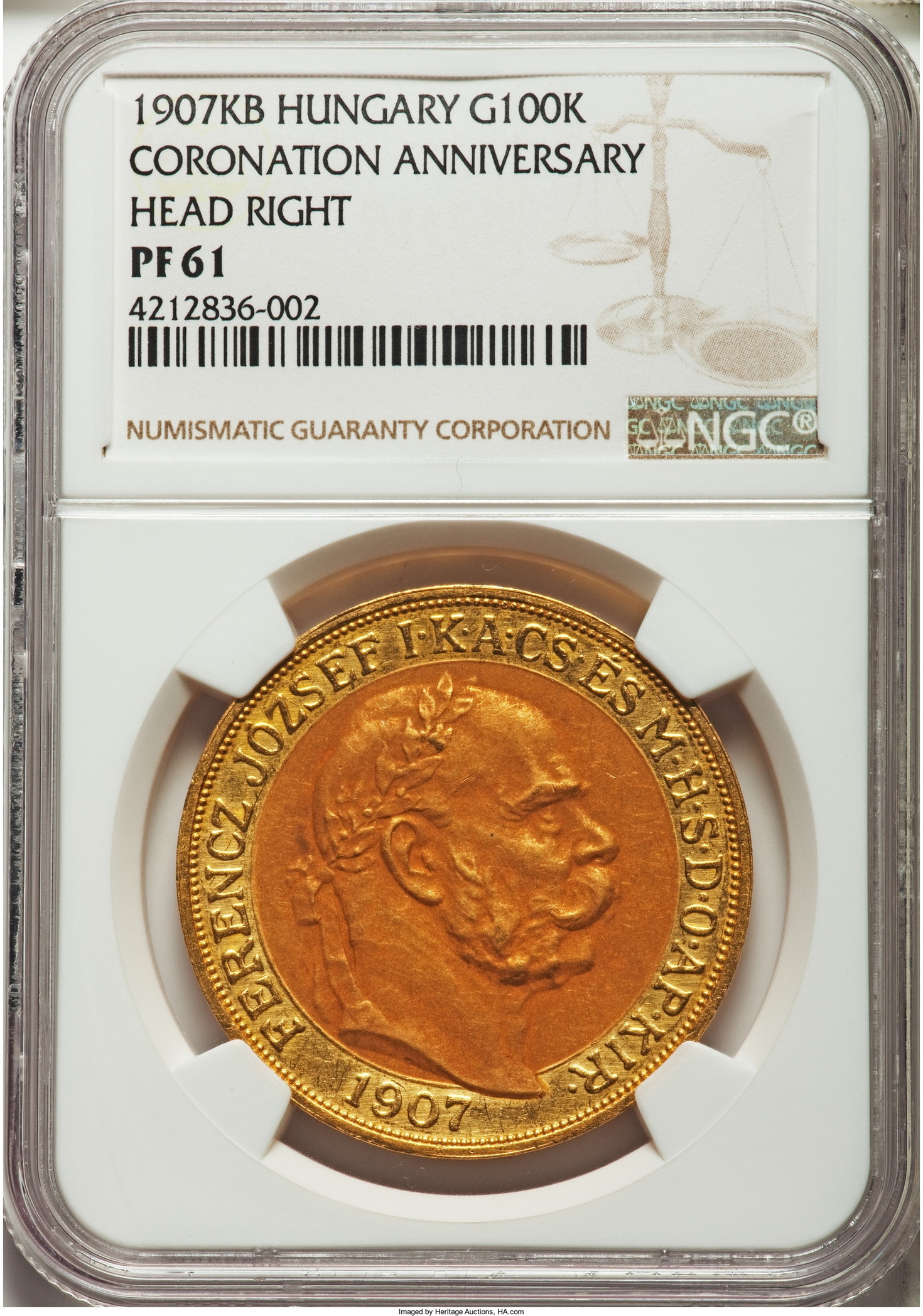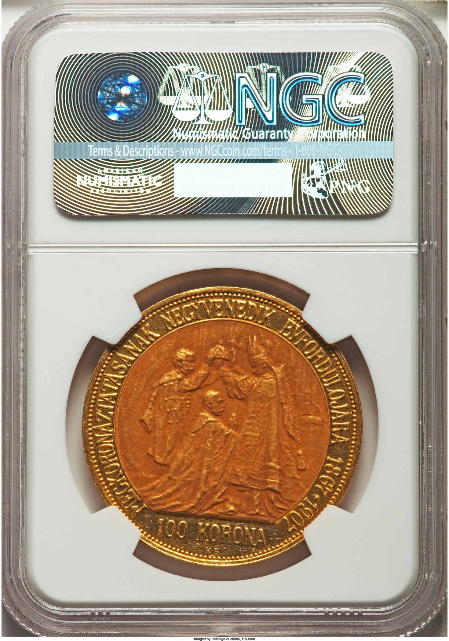 「アンティークコイン金貨専門のゴールドコイン」で取り扱う商品「アンティークコイン ハンガリー 1907年 皇帝戴冠式記念100コロナ金貨 PF61 NGC」の紹介・購入ページ