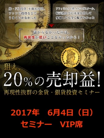「アンティークコイン金貨専門のゴールドコイン」で取り扱う商品「2017年6月4日(日)開催 資産を確実に守りながら、値上がり益を狙う、 知られざるアンティークコイン投資術セミナー VIP席」の紹介・購入ページ