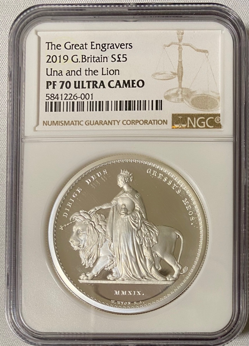 グレートブリテン2019年ウナとライオンプルーフ2オンス5ポンド銀貨NGC社PF70UCAMオリジナル箱付き