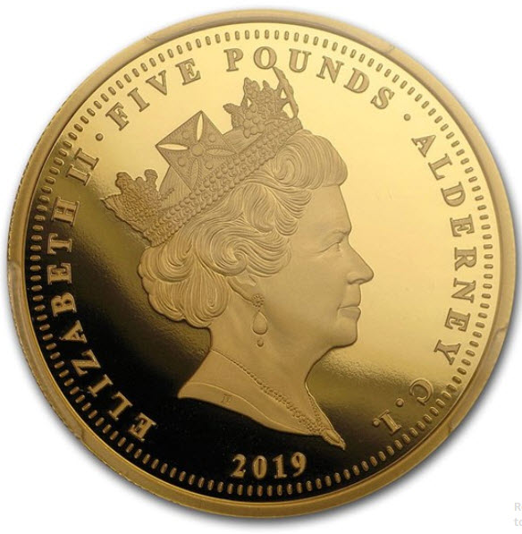 「アンティークコイン金貨専門のゴールドコイン」で取り扱う商品「イギリスの王室属領オルダニー島エリザベス II 2019年5ポンドプルーフ金貨ウナとライオンPCGS PR70 DCAM-38763825」の紹介・購入ページ