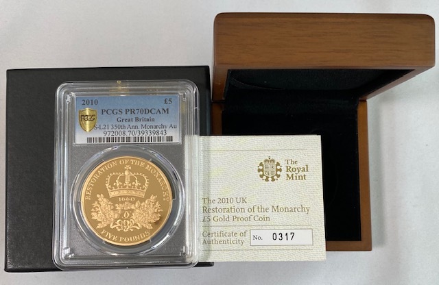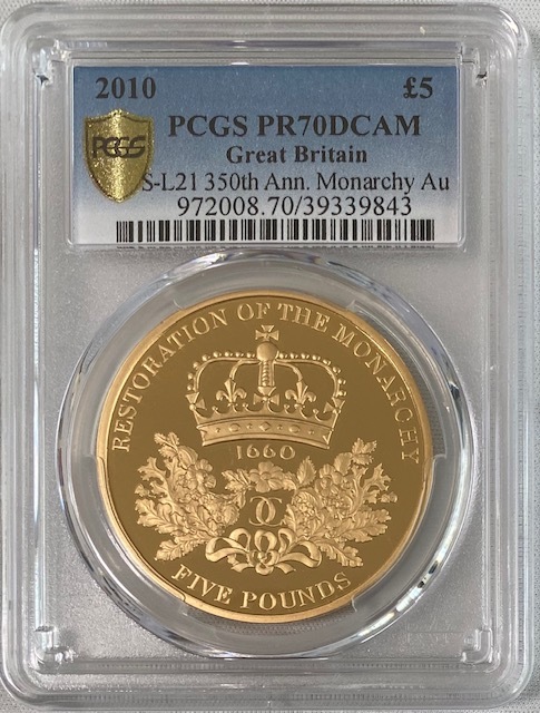 「アンティークコイン金貨専門のゴールドコイン」で取り扱う商品「【動画あり】グレートブリテン2010年王政復古350周年記念1オンス5ポンドプルーフ金貨PCGS-PR70DCAM箱付き」の紹介・購入ページ