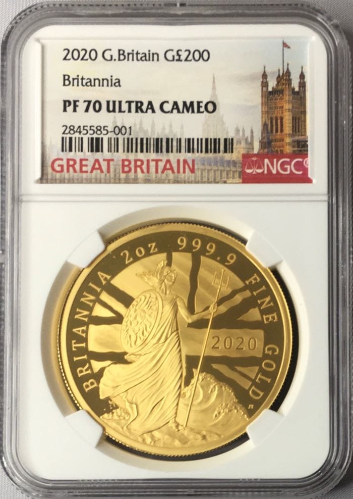 「アンティークコイン金貨専門のゴールドコイン」で取り扱う商品「【動画あり】グレートブリテン 2020年 エリザベス2世 200ポンドプルーフ-ブリタニア金貨 NGC-PF70UCAM」の紹介・購入ページ