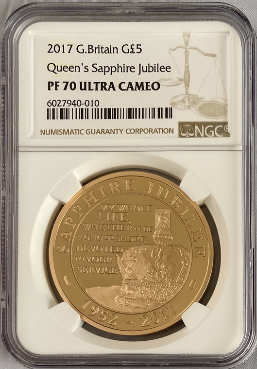 「アンティークコイン金貨専門のゴールドコイン」で取り扱う商品「【動画あり】グレートブリテン2017年エリザベスII世65周年記念サファイアジュビリー5ポンド金貨NGC-PF70UCAMEO6027940-010」の紹介・購入ページ
