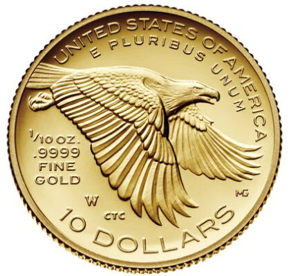 刻印は "UNITED STATES OF AMERICA"、"E PLURIBUS UNUM"、"1/10 OZ. .9999 FINE GOLD"、"10 DOLLARS "です。