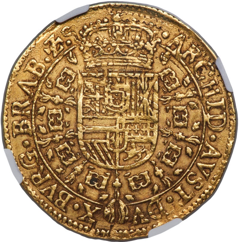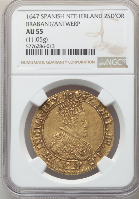 「アンティークコイン金貨専門のゴールドコイン」で取り扱う商品「スパニッシュ・ネザーランド1647年フィリップ4世2ソブリン・ドールNGC-AU55」の紹介・購入ページ