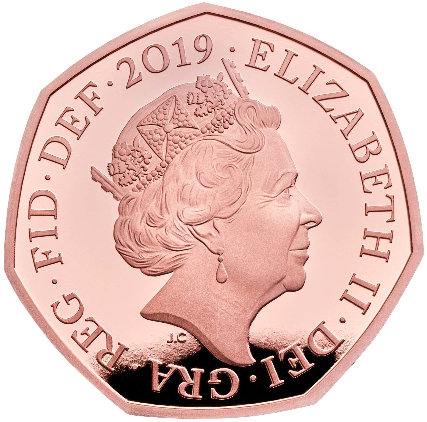 右向きのHMエリザベス2世の第5肖像、下にJC、ELIZABETH - II - D - G REG - F - D - 2019。デザインはジョディ・クラーク。