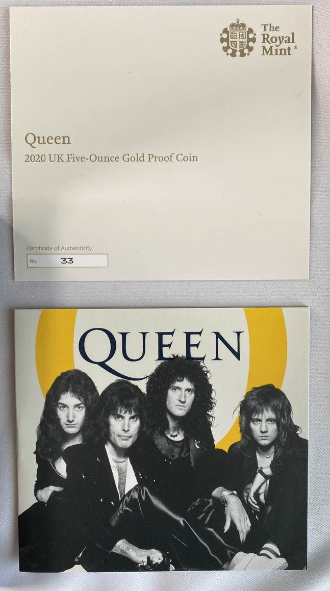 「アンティークコイン金貨専門のゴールドコイン」で取り扱う商品「グレートブリテン 2020年 音楽の伝説シリーズクイーン 5オンス500ポンドプルーフ金貨オリジナル箱付き」の紹介・購入ページ