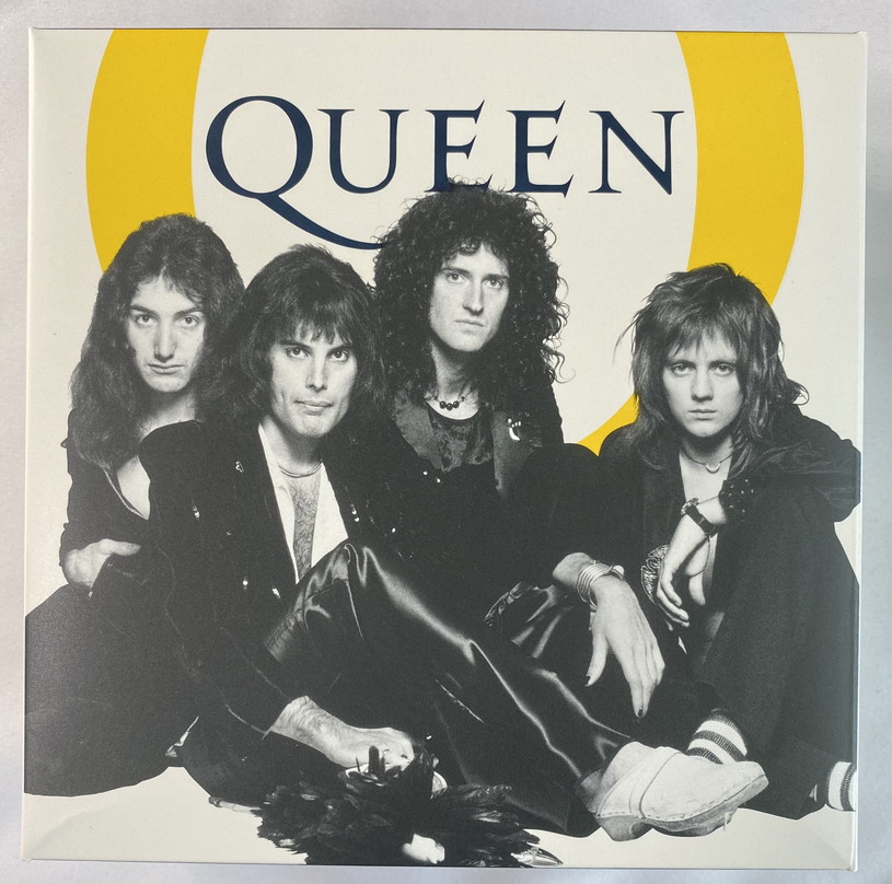 クイーンのロゴは中央に配置され、フレディの署名マイクスティックで強調されています。