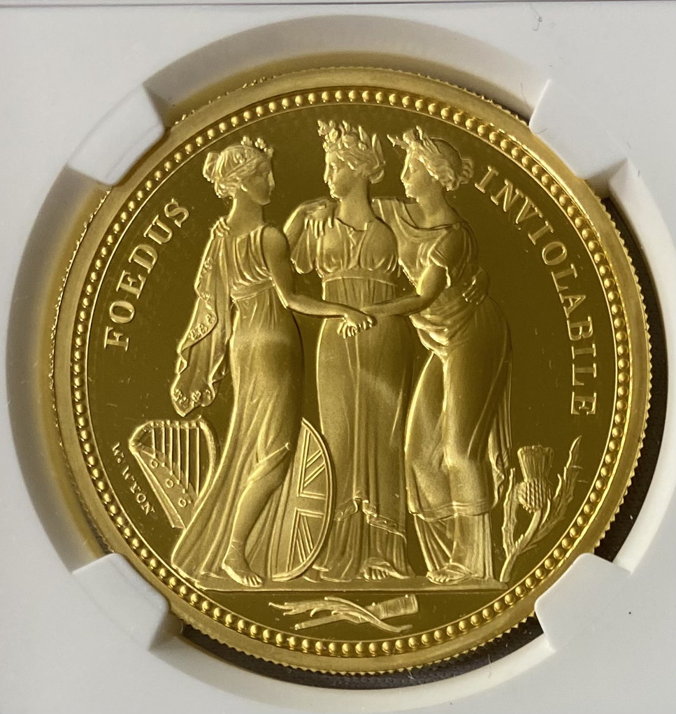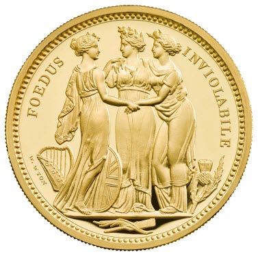 ウィリアム・ワイオン作。有名な1839年の「Una」と「Lion 5 Pounds」と並んで、1817年の「Three Graces」クラウンはワイオンの最も有名なメダリックアートの作品である。