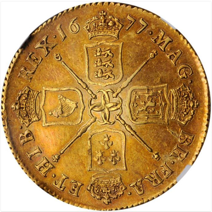 「アンティークコイン金貨専門のゴールドコイン」で取り扱う商品「【動画あり】【レア度2-R2】グレートブリテン1677年チャールズ2世2ギニー金貨NGC-AU53」の紹介・購入ページ