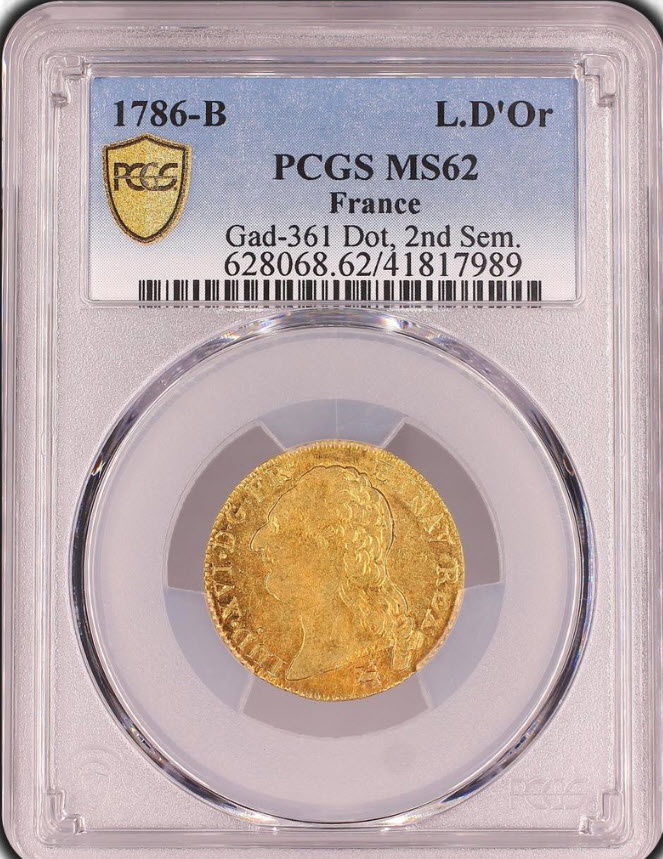 「アンティークコイン金貨専門のゴールドコイン」で取り扱う商品「【動画あり】【レア度1-R1】フランス 1786-B年 ルイ16世 1ルイドール金貨 PCGS-MS62」の紹介・購入ページ