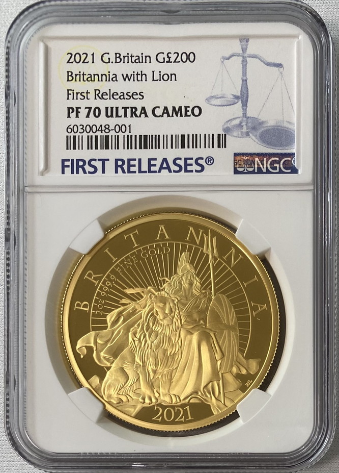 「アンティークコイン金貨専門のゴールドコイン」で取り扱う商品「【動画あり】グレートブリテン 2021年 エリザベス2世 純金2オンス 200ポンドプルーフ・ライオンとブリタニア金貨 NGC-PF70UCAM ファーストリリース5704777-001」の紹介・購入ページ