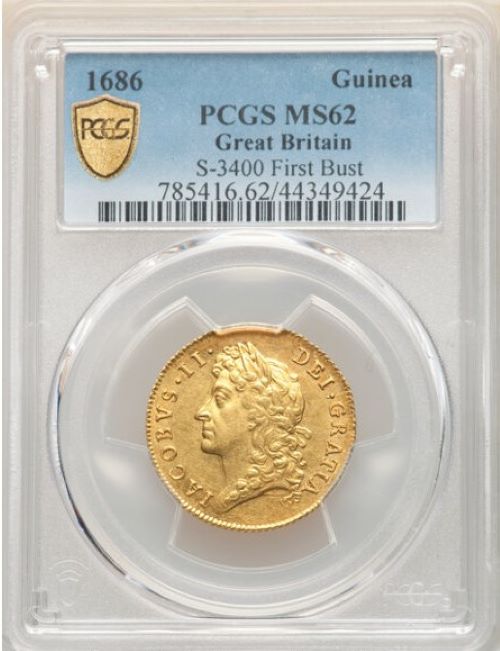 「アンティークコイン金貨専門のゴールドコイン」で取り扱う商品「【動画あり】グレートブリテン 1686年 ジェームズ2世 1ギニー金貨 PCGS-MS62」の紹介・購入ページ