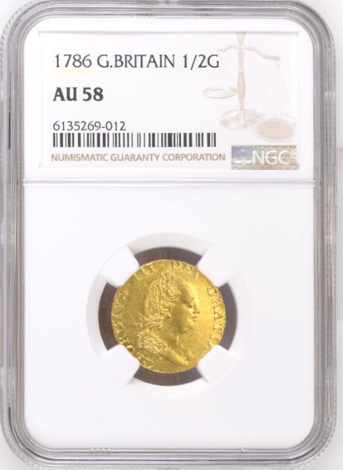 「アンティークコイン金貨専門のゴールドコイン」で取り扱う商品「【動画あり】グレートブリテン 1786年 ジョージ3世 1/2ギニー金貨 NGC-AU58」の紹介・購入ページ