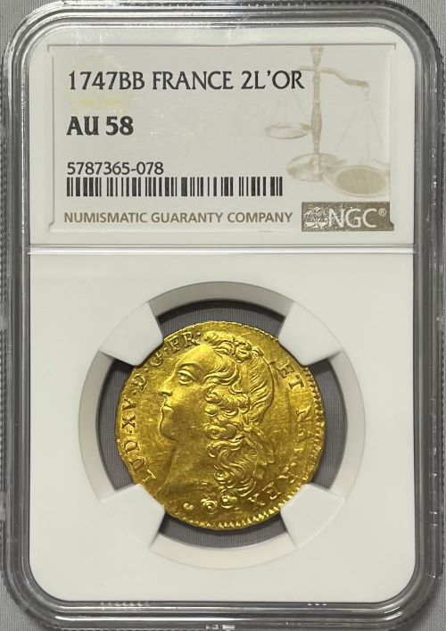 「アンティークコイン金貨専門のゴールドコイン」で取り扱う商品「【動画あり】フランス 1747-BB年 ルイ15世 2ルイドール金貨 NGC-AU58」の紹介・購入ページ
