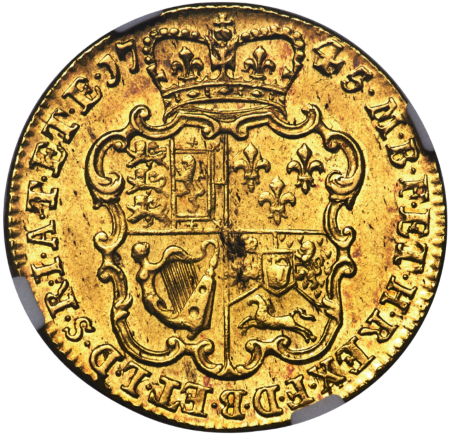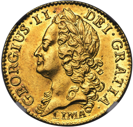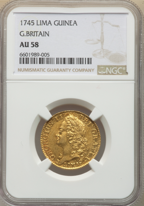 「アンティークコイン金貨専門のゴールドコイン」で取り扱う商品「【レア度1-R1】グレートブリテン 1745年LIMA ジョージ2世 1ギニー金貨 NGC-AU58」の紹介・購入ページ