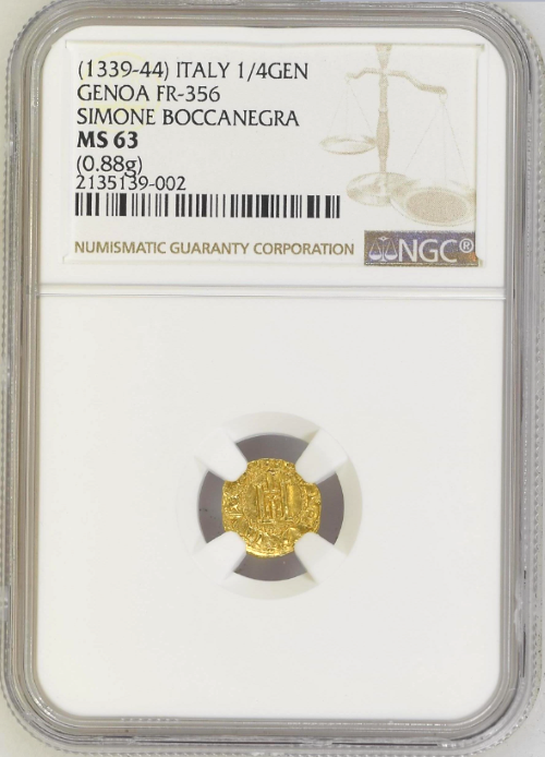 「アンティークコイン金貨専門のゴールドコイン」で取り扱う商品「【レア度1-R1】イタリア ジェノヴァ共和国 1339-44年 シモン・ボッカネグラ (第1代ドージェ) 1/4ジェノヴィーノ金貨 NGC-MS63」の紹介・購入ページ