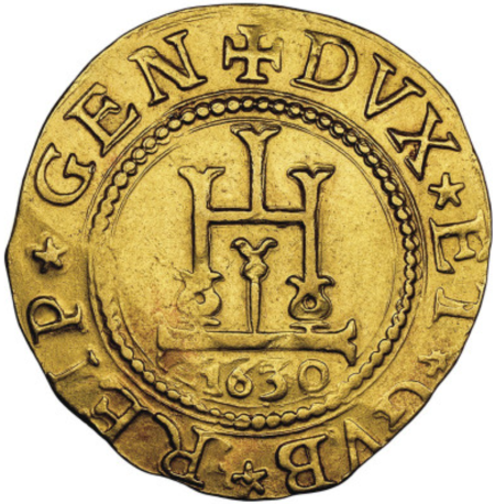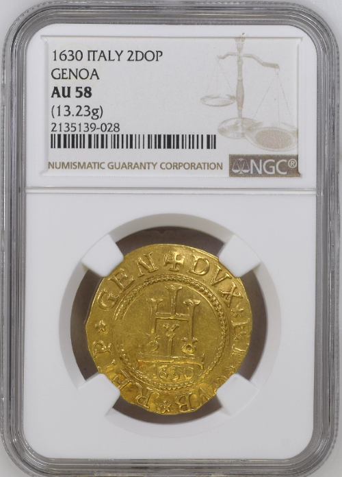 「アンティークコイン金貨専門のゴールドコイン」で取り扱う商品「【レア度2-R2】イタリア ジェノヴァ共和国 1630年 アンドレア・スピノーラ (第99代ドージェ) ビエンナーレ・ドージェ 2ドッピア金貨 NGC-AU58」の紹介・購入ページ