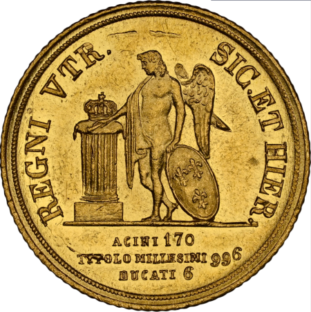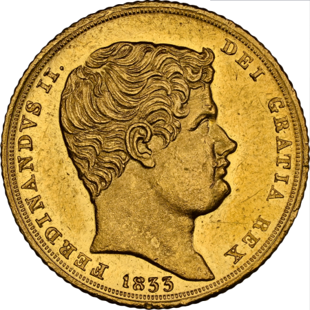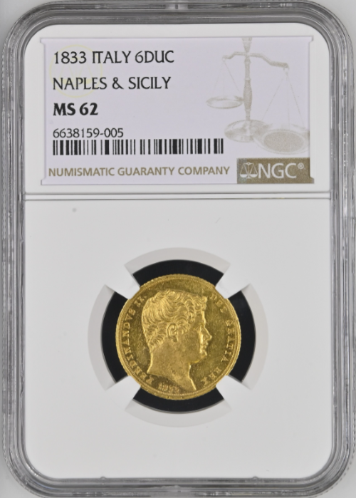 「アンティークコイン金貨専門のゴールドコイン」で取り扱う商品「【動画あり】【レア度2-R2】イタリア 1833年 フェルディナンド2世 6ドゥカティ金貨 NGC-MS62」の紹介・購入ページ