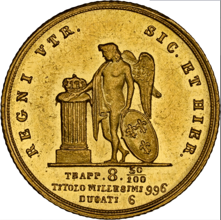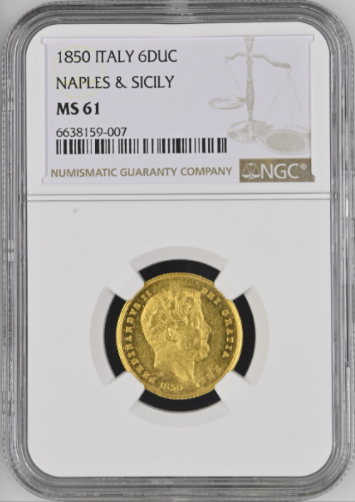 「アンティークコイン金貨専門のゴールドコイン」で取り扱う商品「【動画あり】【レア度2-R2】イタリア 1850年 フェルディナンド2世 6ドゥカティ金貨 NGC-MS61」の紹介・購入ページ