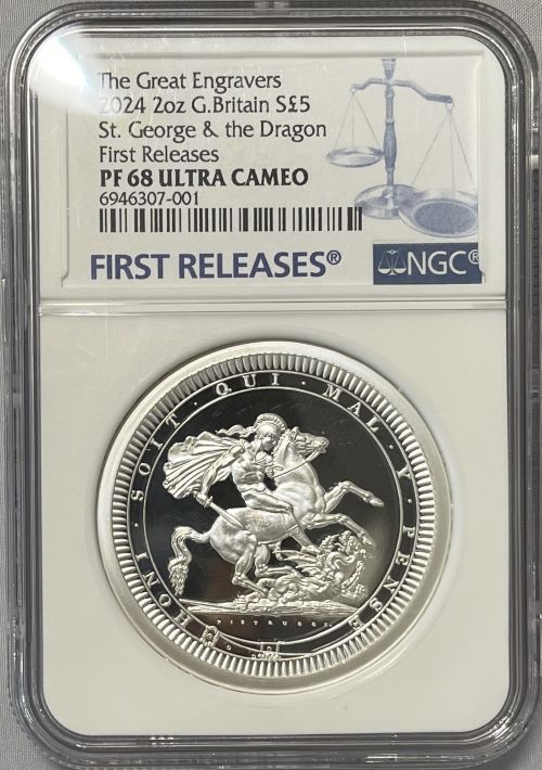 【動画あり】【ファーストリリース】グレートブリテン 2024年 ジョージ三世 セント・ジョージとドラゴン 2オンス 5ポンド プルーフ銀貨 NGC-PF68 UCAM The Great Engravers Collection