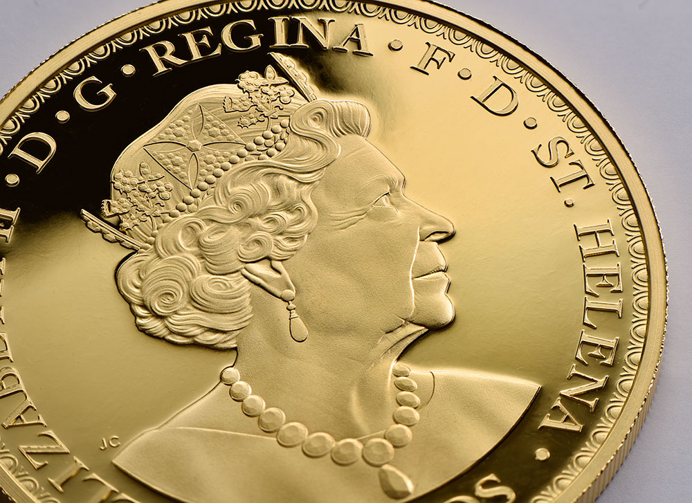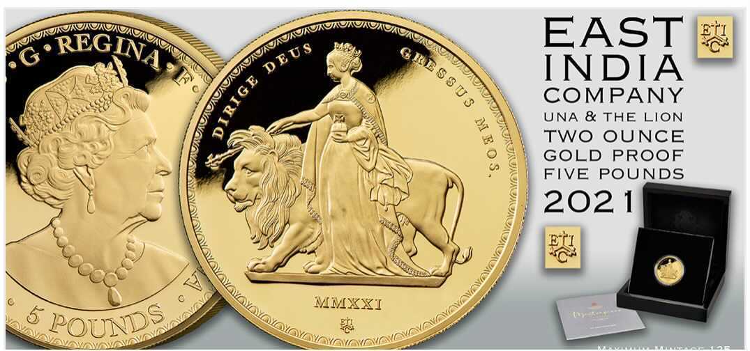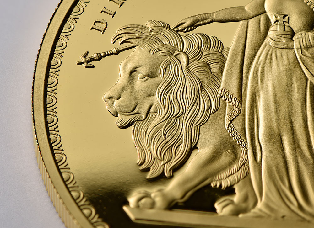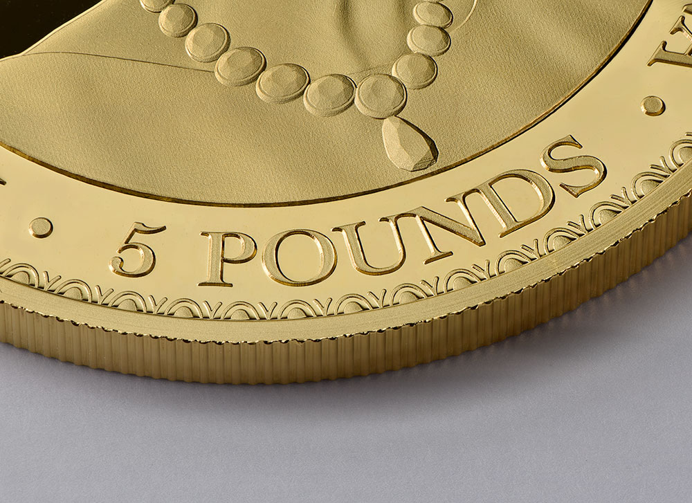 この伝説的な「ウナとライオン」をモチーフにした5ポンド金貨は、エドモンド・スペンサーの1590年の詩「The Faerie Queene(妖精の女王)」の登場人物であるウナ夫人を、流れるようなガウンを着て立っている若き女王の姿で表現しています。