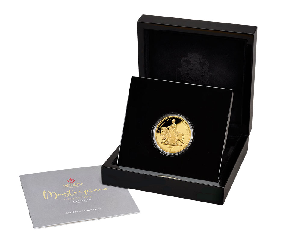 1839年のオリジナルを再現したウナライオンの2オンスプルーフ金貨です。