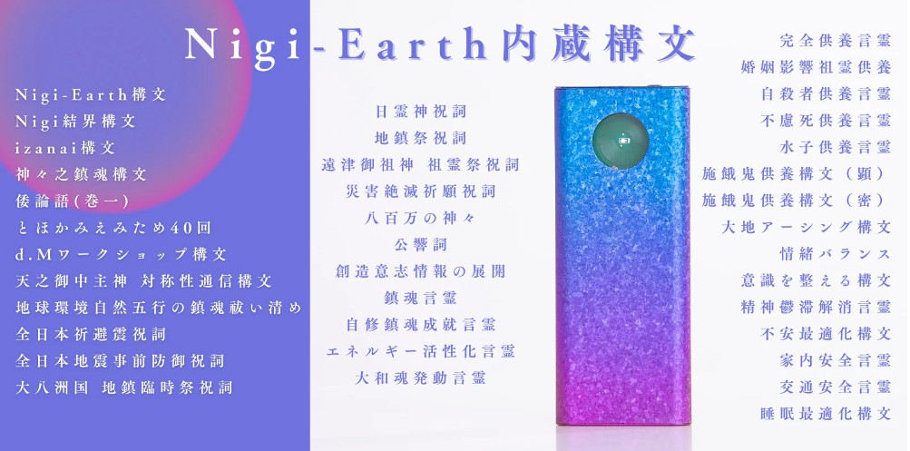 また、Nigi-Earthは、祈りや瞑想の際、感情や思考を鎮め、真実への目覚めを助ける「倭論語構文」、天地創造のエネルギーを鎮魂に結びつける「天之御中主神構文」を内蔵。