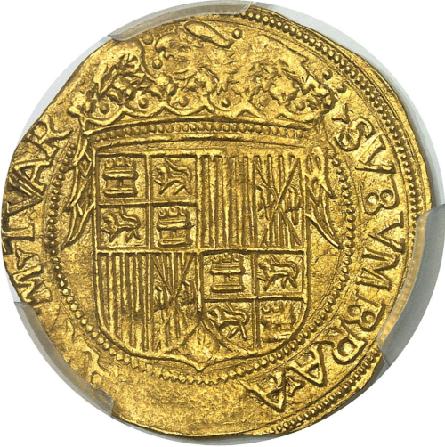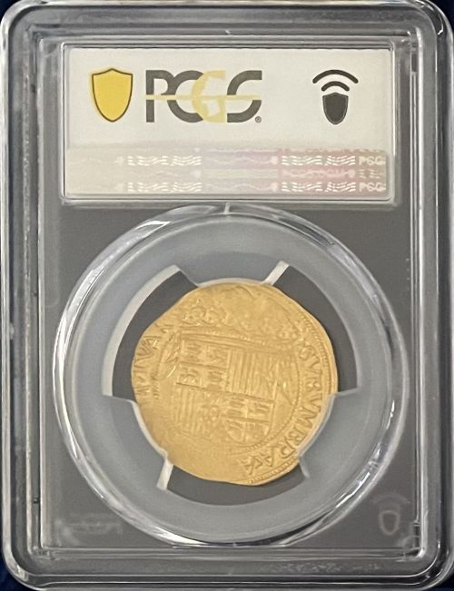 フェリペ2世治世下で鋳造されたこのタイプの金貨は、17世紀初頭のフェリペ3世、フェリペ4世の時代にも継続的に発行されていましたが、状態良好な現存品は極めて希少です。