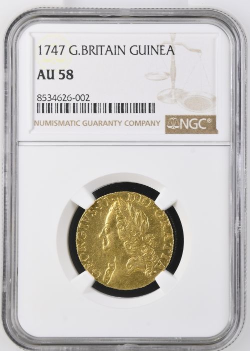 「アンティークコイン金貨専門のゴールドコイン」で取り扱う商品「【レア度4-R4】グレートブリテン 1747年 ジョージ2世 1ギニー金貨 NGC-AU58」の紹介・購入ページ