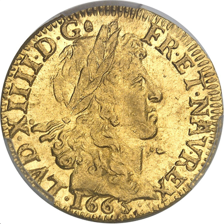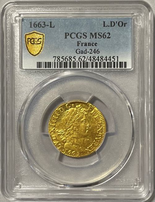 「アンティークコイン金貨専門のゴールドコイン」で取り扱う商品「【レア度4-R4】フランス 1663-L年 ルイ14世 1ルイドール金貨 PCGS-MS62」の紹介・購入ページ