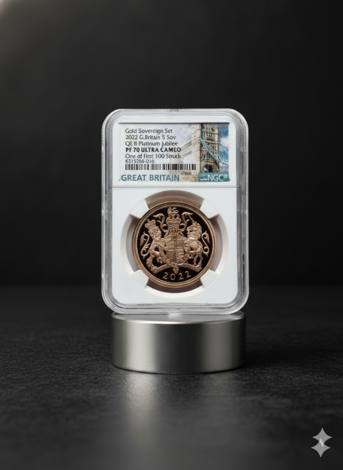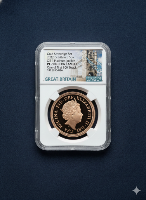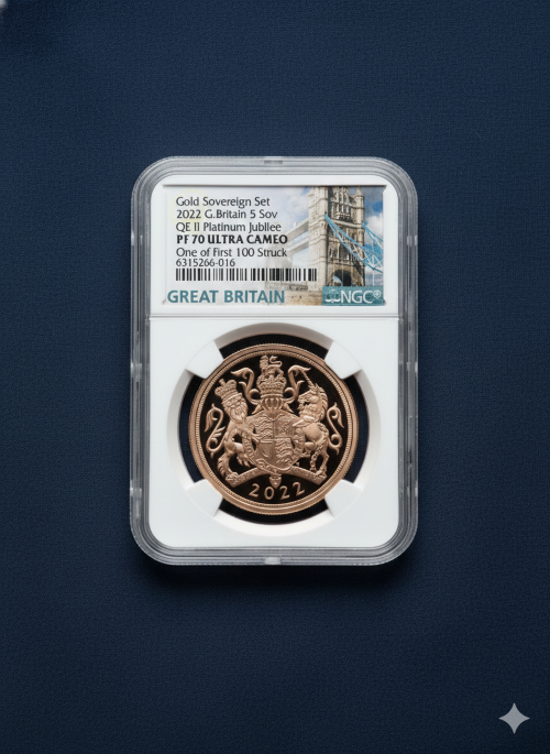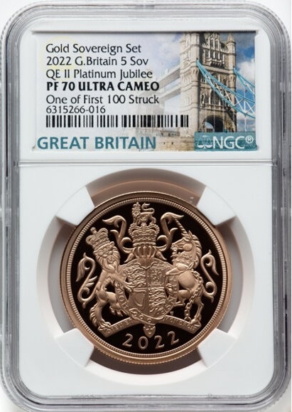 「アンティークコイン金貨専門のゴールドコイン」で取り扱う商品「【One of First 100 Struck】グレートブリテン 2022年 エリザベス2世 在位70周年記念 プラチナ・ジュビリー 5ソブリン プルーフ金貨 NGC-PF70 UCAM」の紹介・購入ページ