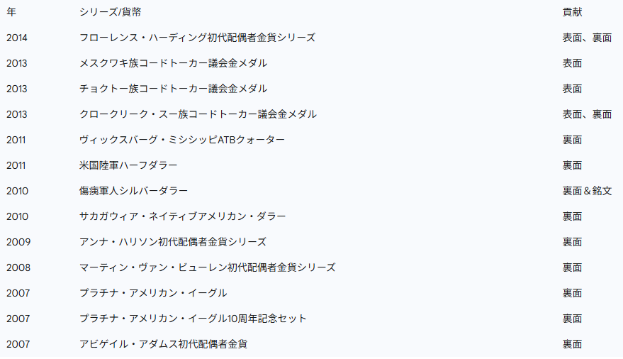 彼は2004年から2014年まで、米国造幣局の芸術家注入プログラム(AIP)のオリジナル・マスターデザイナーとして活躍しました 。
