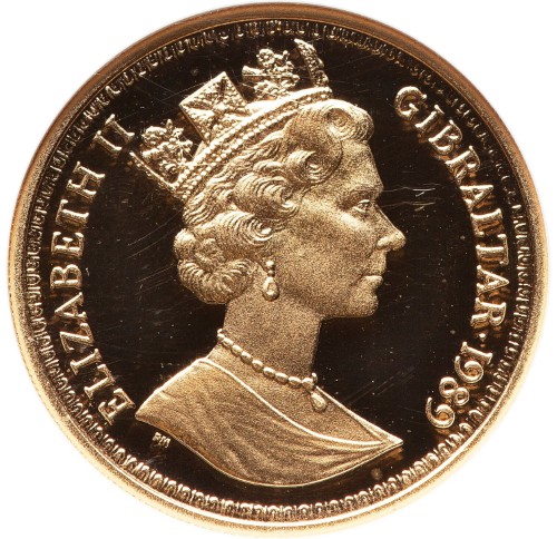 女王の首元にはデザイナーのイニシャル「RDM」が刻まれており、周囲には「ELIZABETH II GIBRALTAR・1989」の文字が配されている。