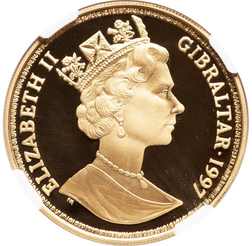 刻印には ELIZABETH II GIBRALTAR · 1997 と記されており、肖像の切断部にはデザイナーのイニシャル RDM が、そして鋳造所を示す PM のミントマークが確認できる。