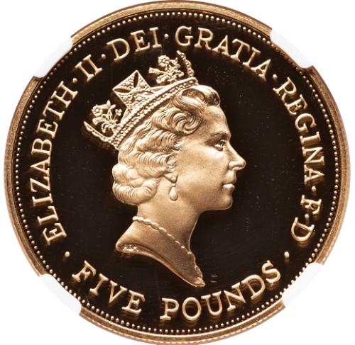 周囲の刻印はラテン語で「ELIZABETH II DEI GRATIA REGINA F D」であり、さらに額面である「FIVE POUNDS」が下部に配置されている。