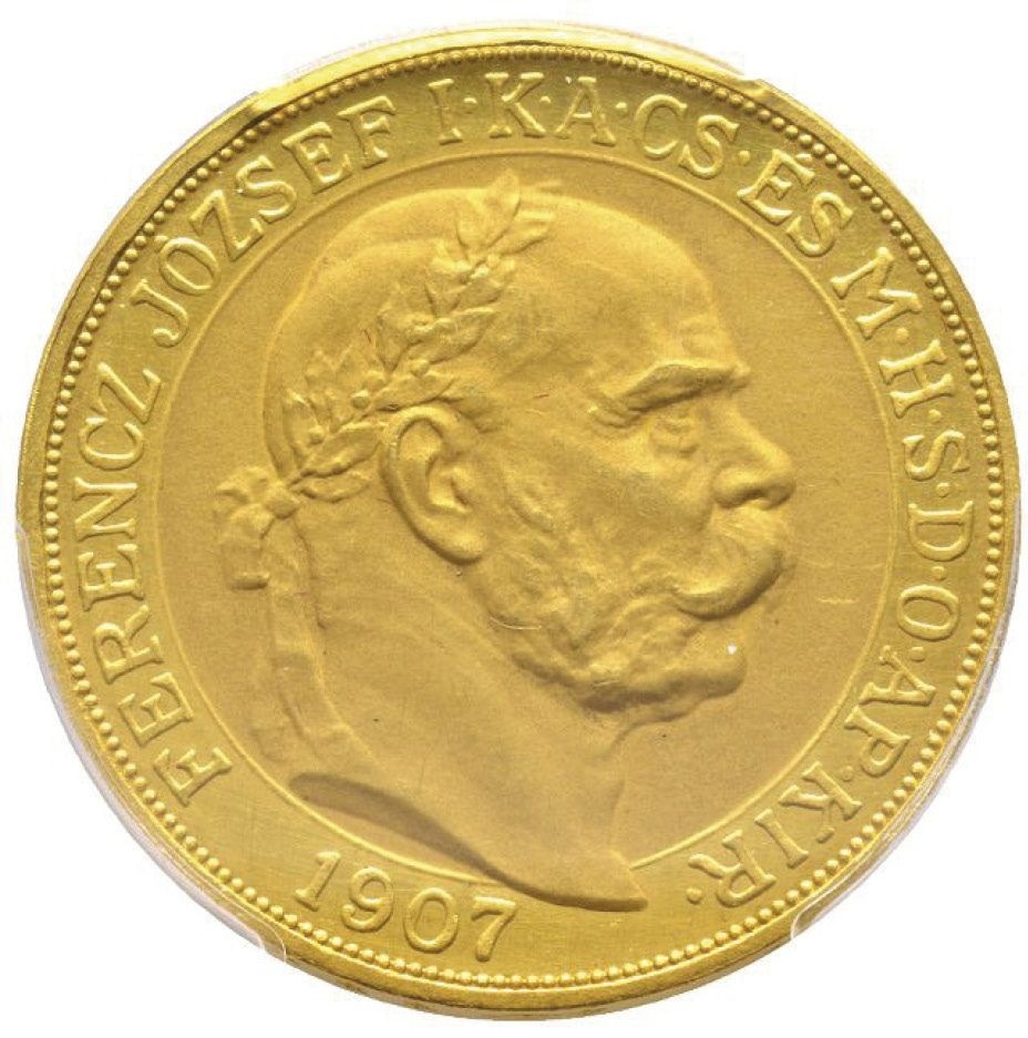 「アンティークコイン金貨専門のゴールドコイン」で取り扱う商品「【動画あり】ハンガリー 1907年 フランツ・ヨーゼフ1世 戴冠式記念 100コロナ金貨 PCGS MS63」の紹介・購入ページ